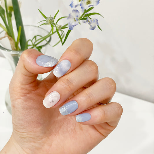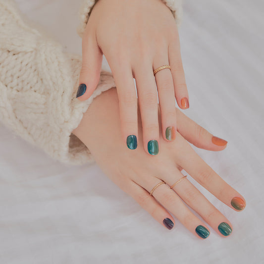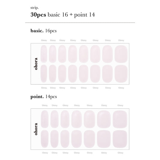 30 self-adhesive nail wraps in 12 (US) or 18 (Korean) different sizes*, manicure sticks, nail file, prep pad
