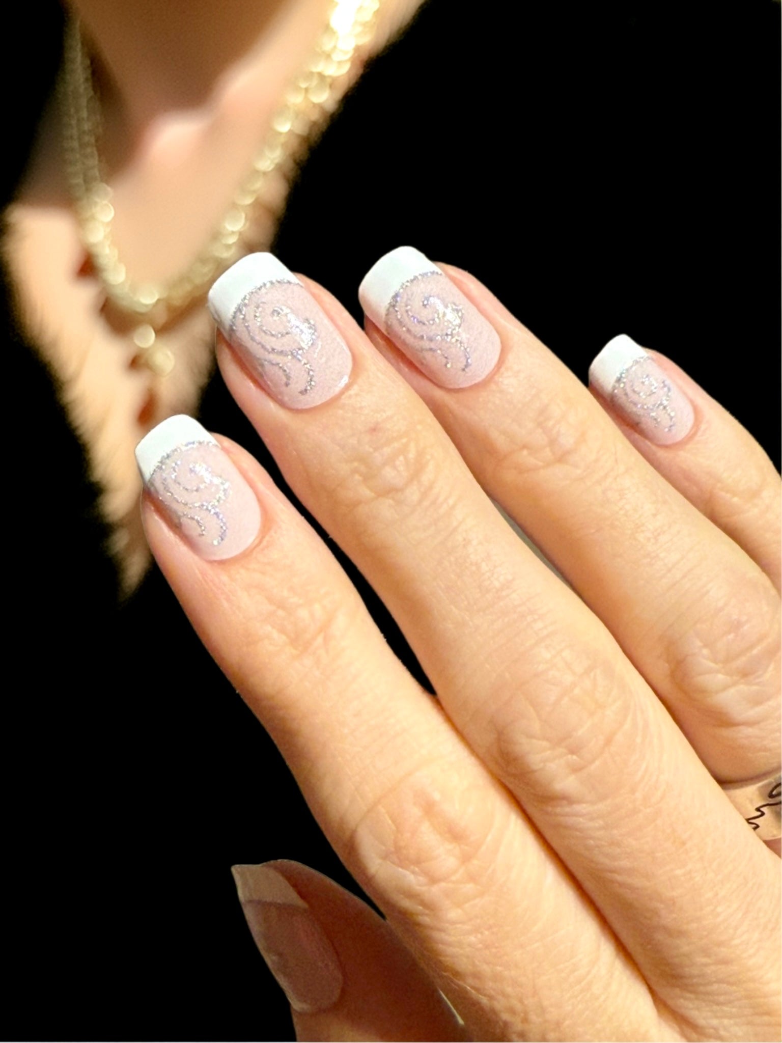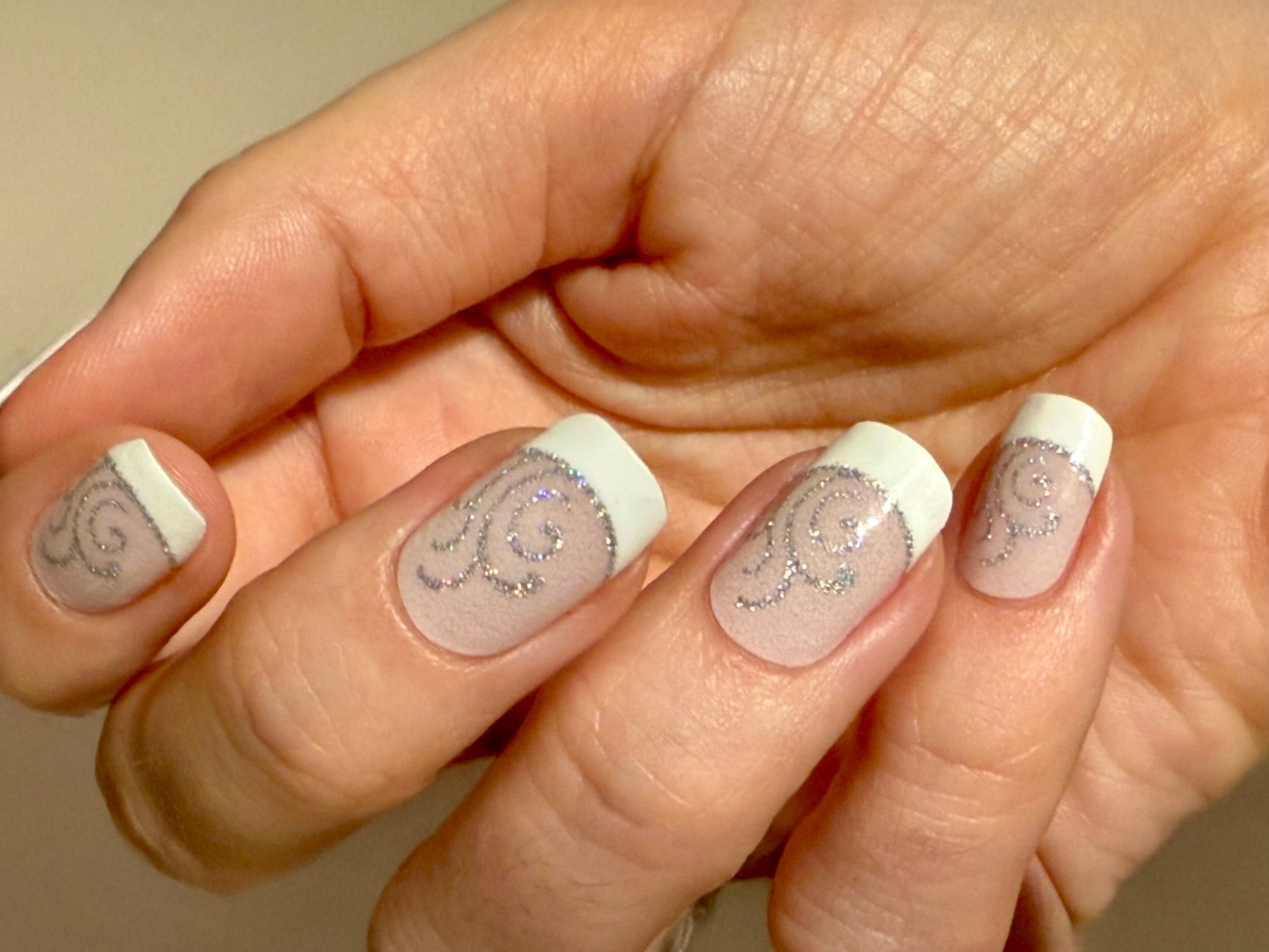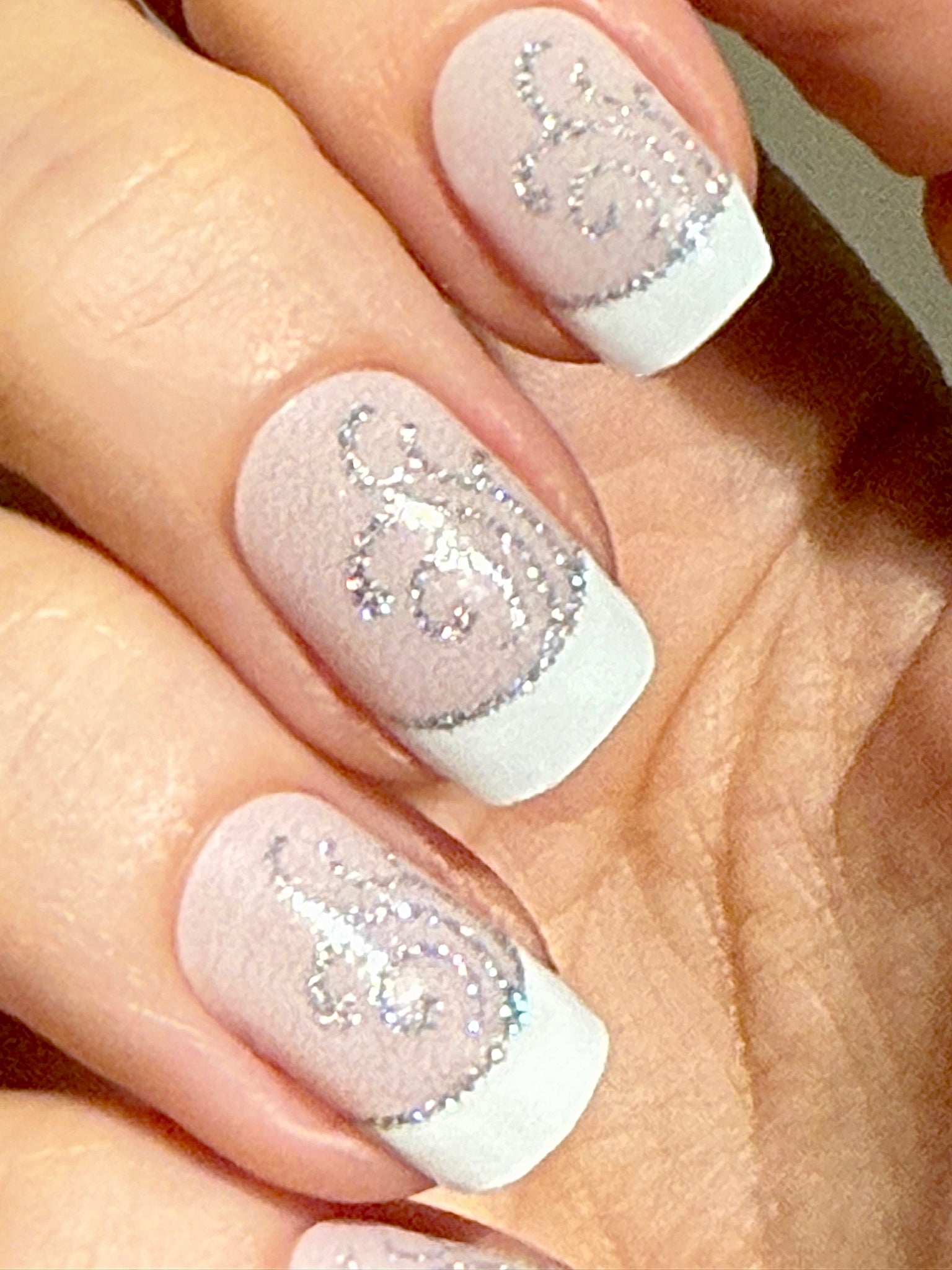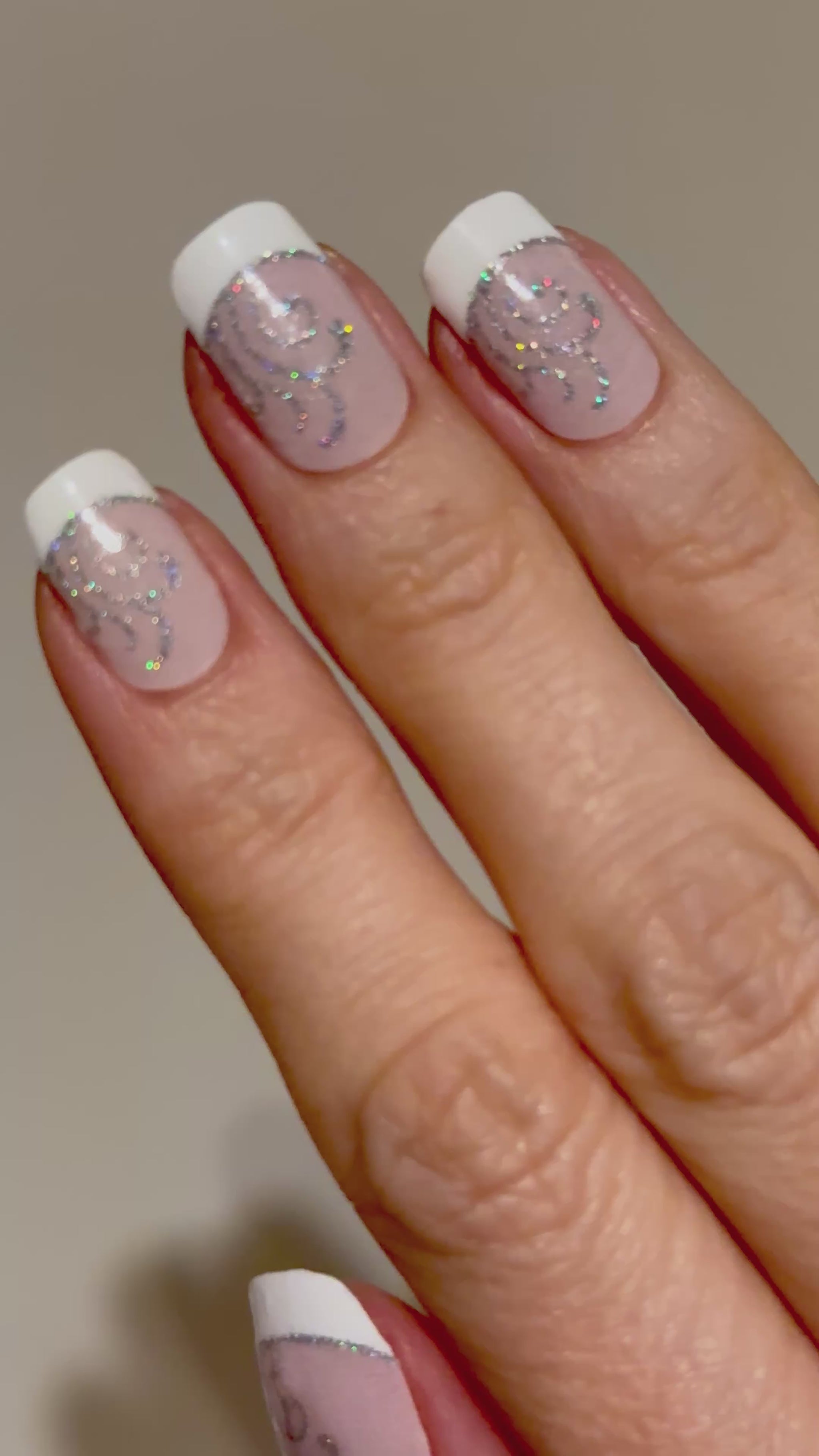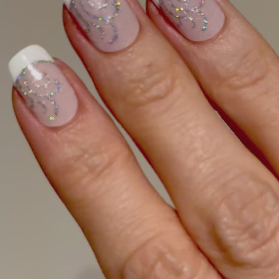 French-Folie mit Hologlitzer-Verzierung. Der hautfarbene Teil ist leicht semitransparent. Geeignet für mittlere bis lange Nagelbetten.