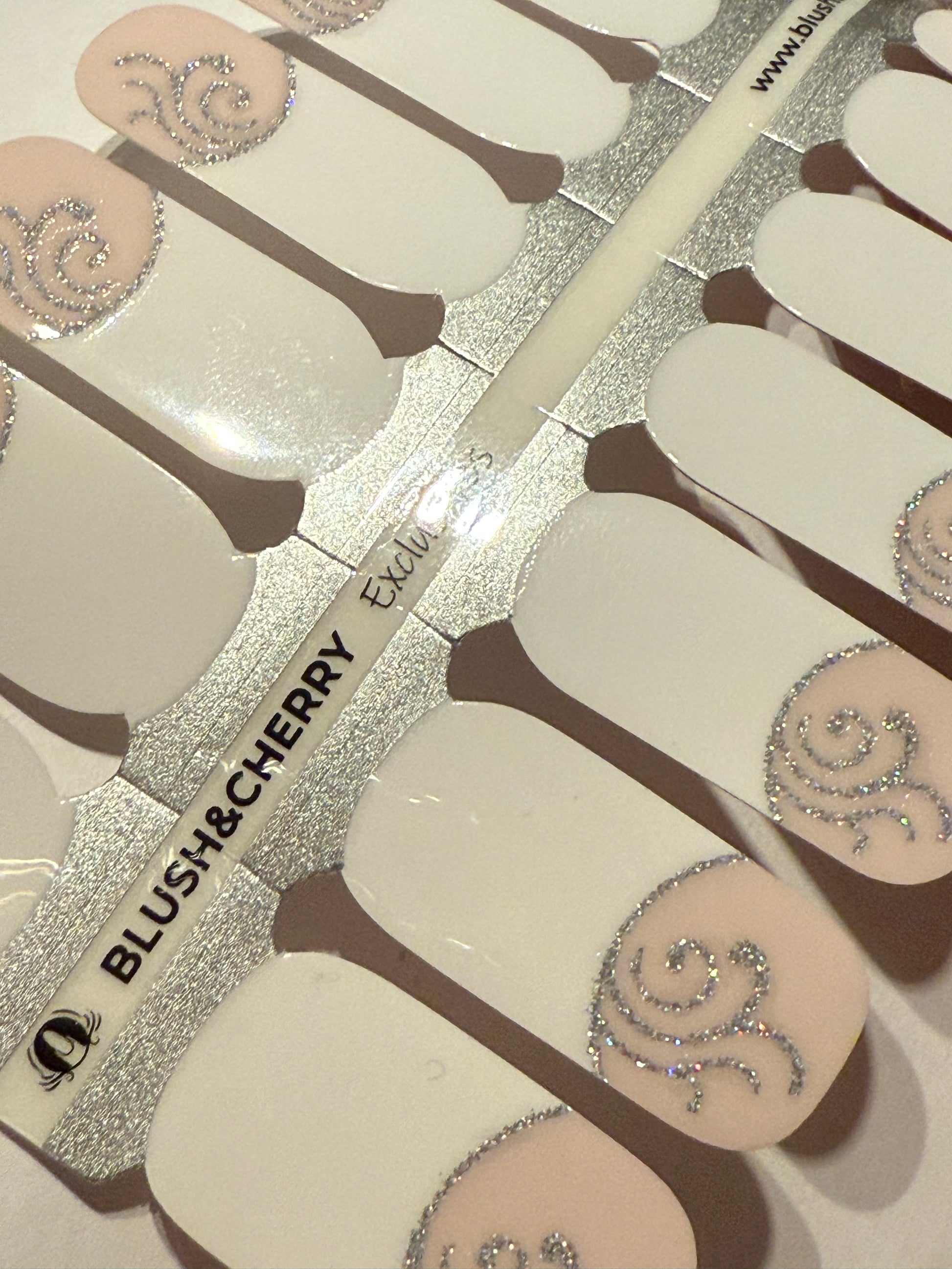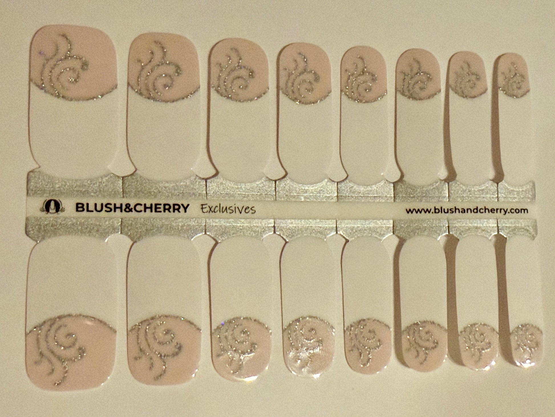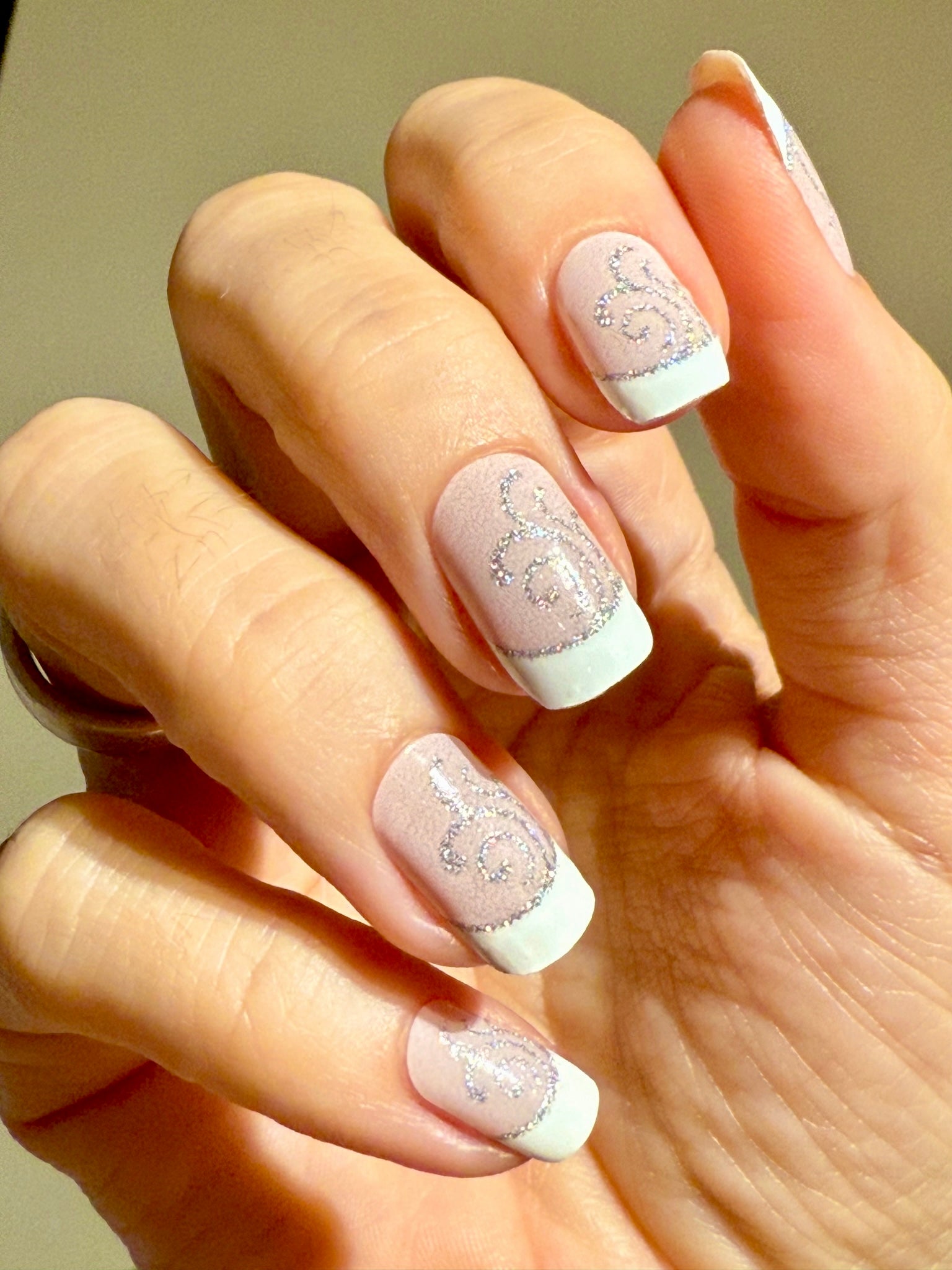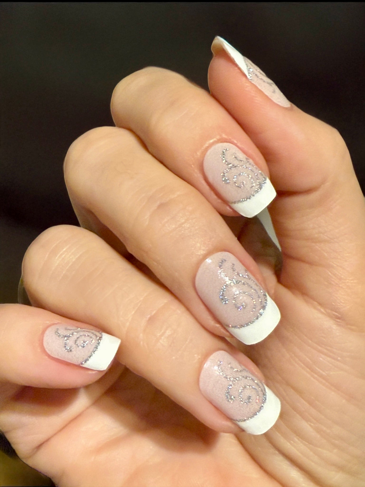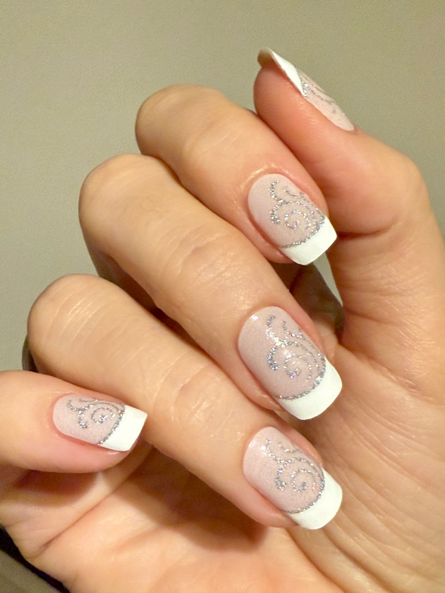French-Folie mit Hologlitzer-Verzierung. Der hautfarbene Teil ist leicht semitransparent. Geeignet für mittlere bis lange Nagelbetten.