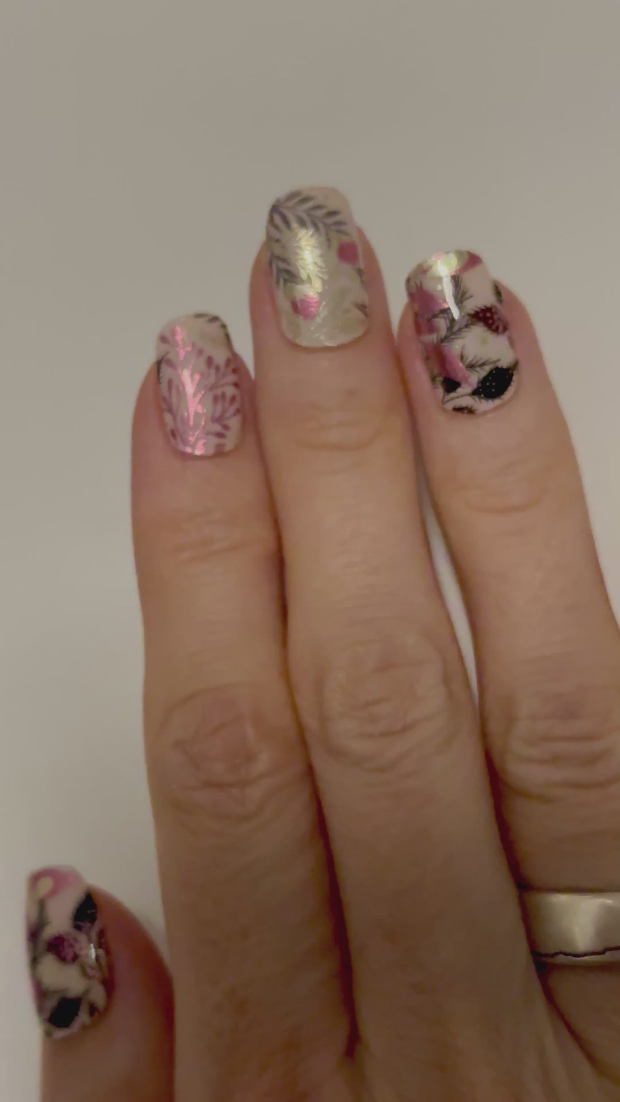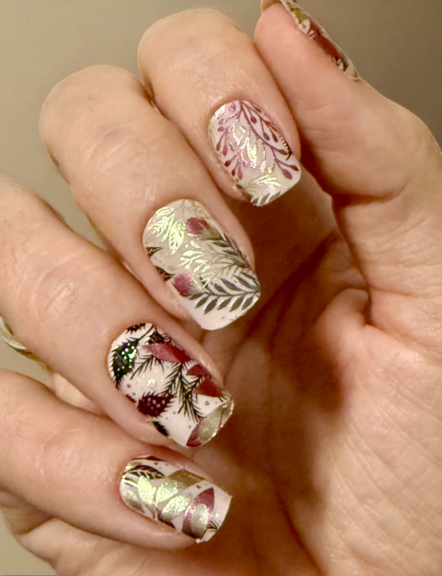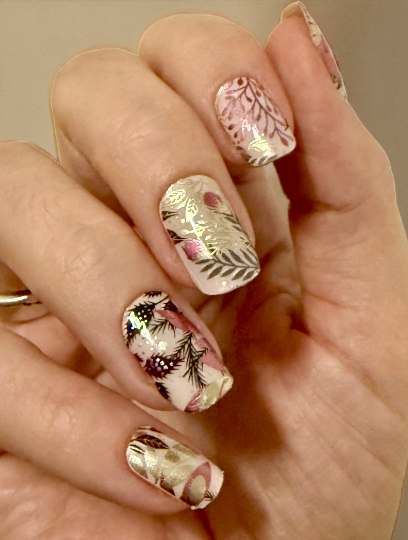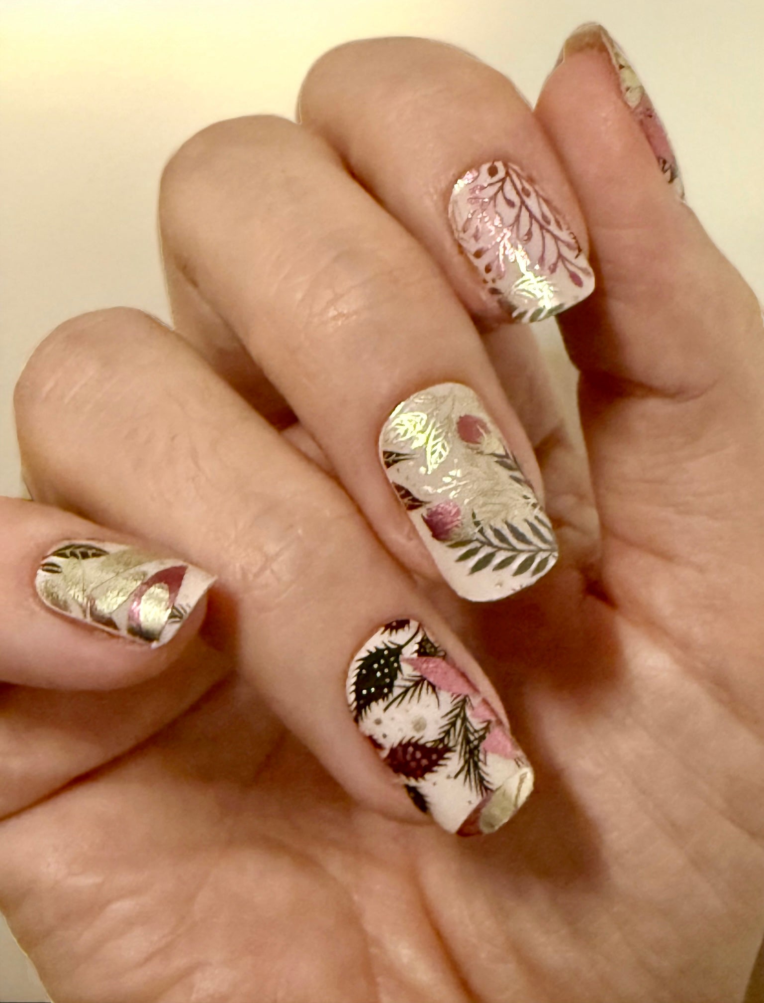 Overlay mit metallischen Pflanzen, Blättern und Ranken. Auf den Tragefotos geklebt auf “Uni Alabaster”.