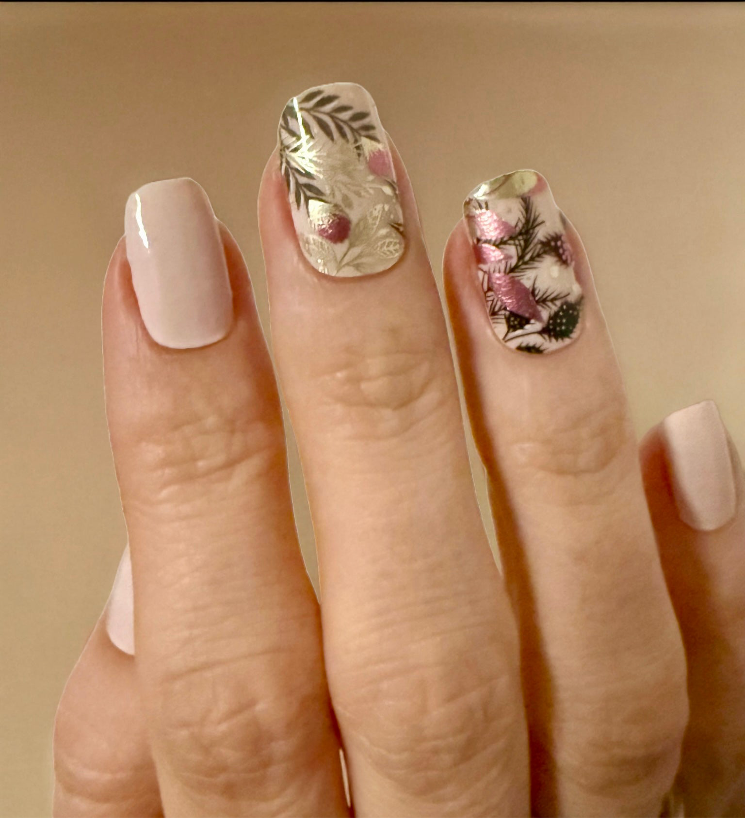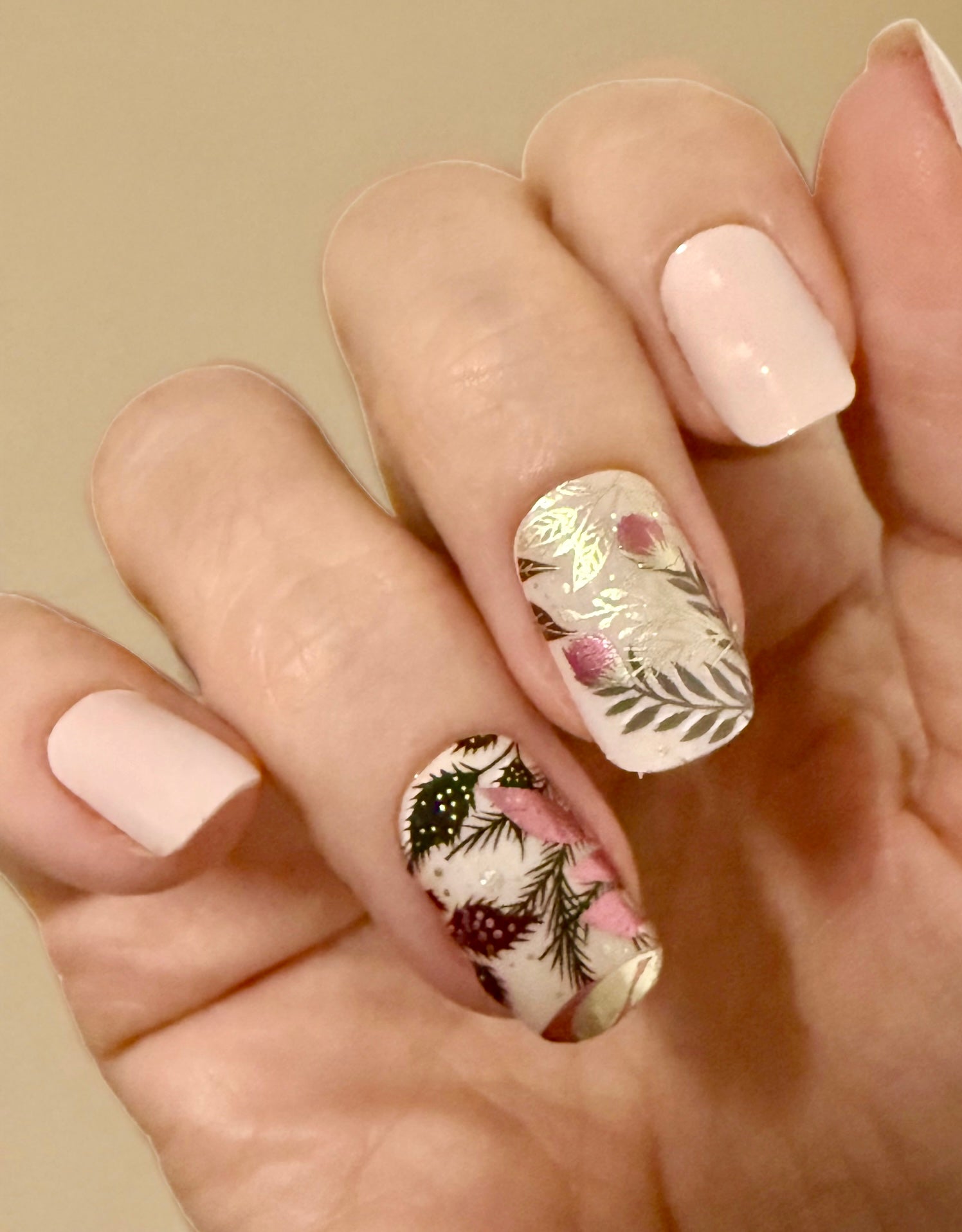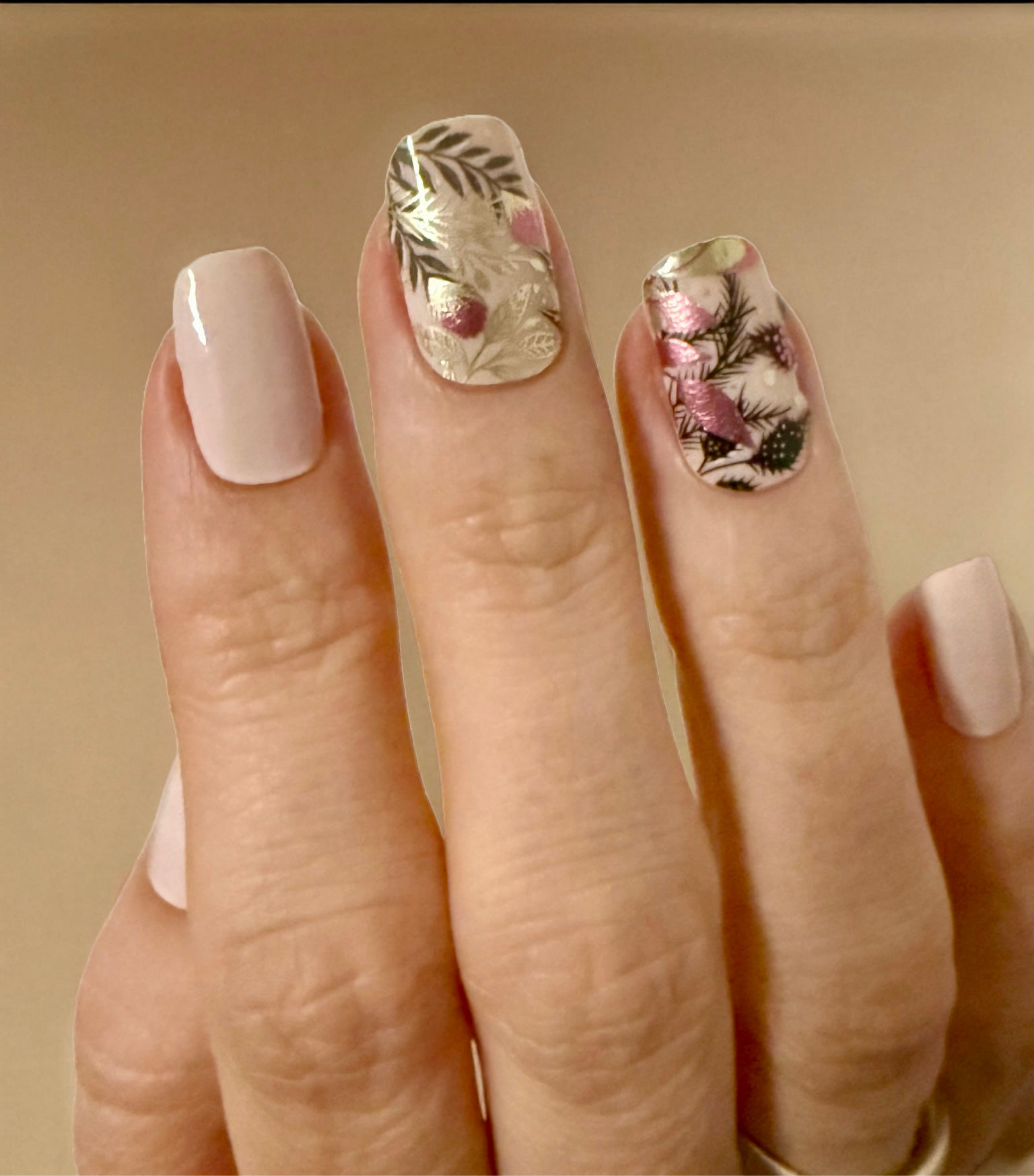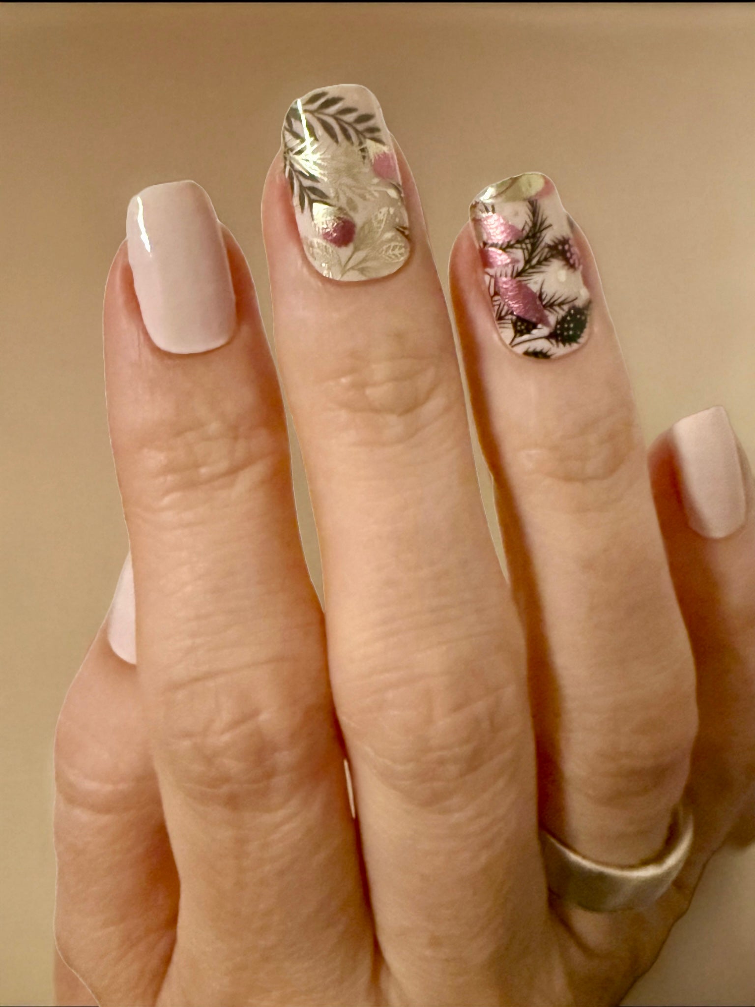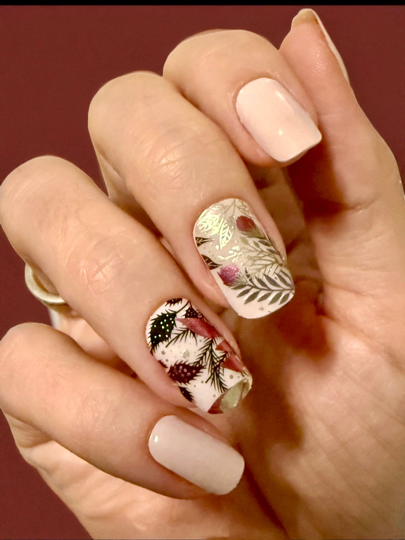 Overlay mit metallischen Pflanzen, Blättern und Ranken. Auf den Tragefotos geklebt auf “Uni Alabaster”.