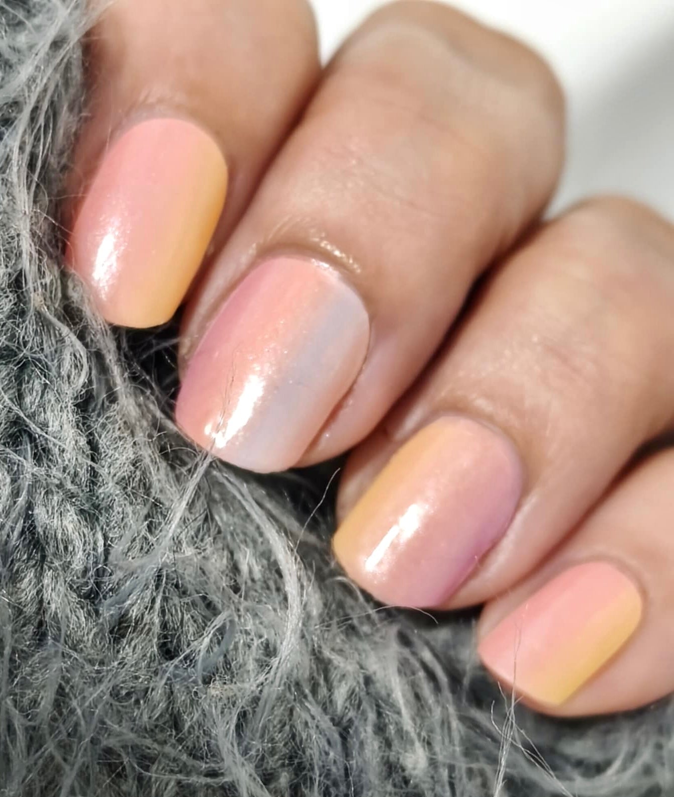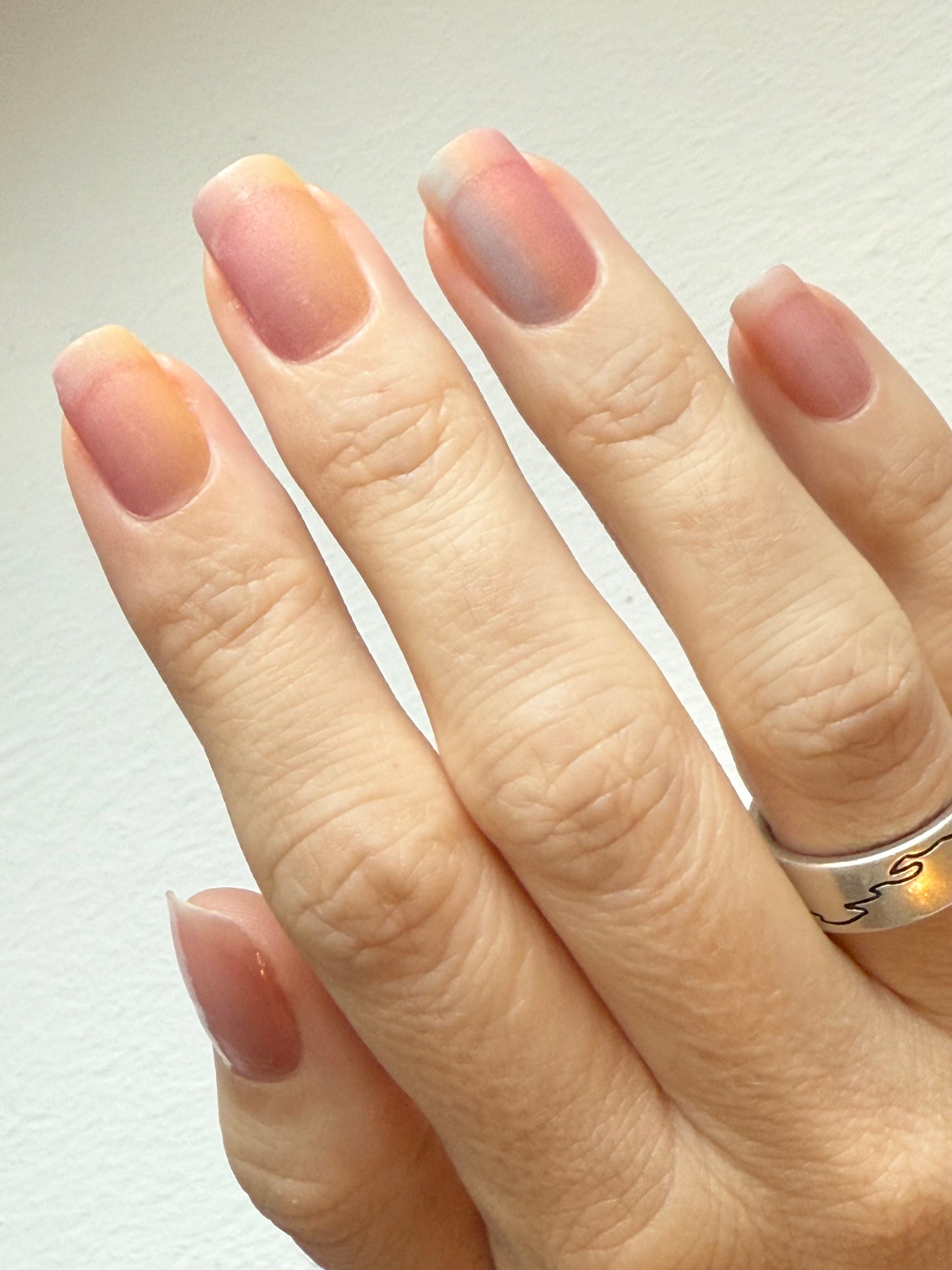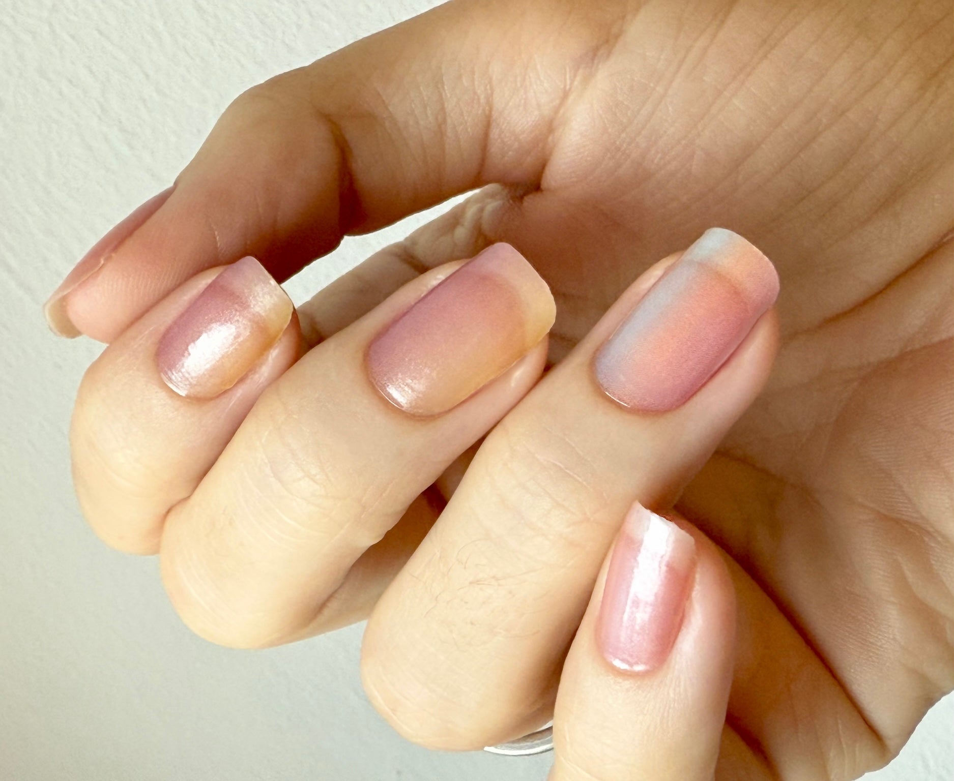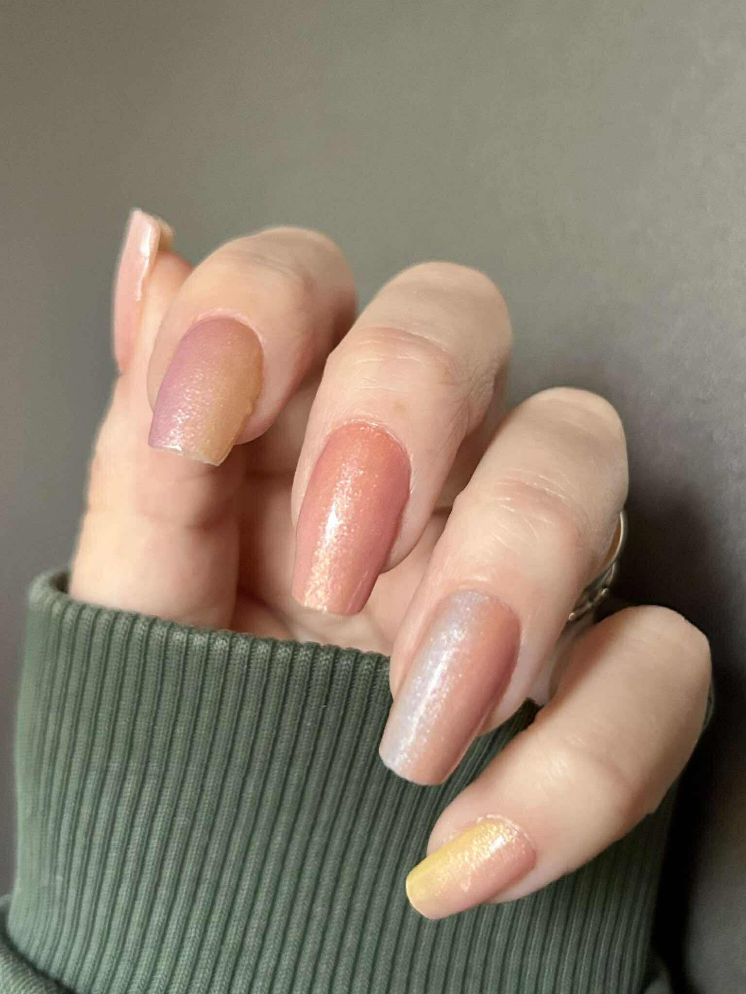 Stark semitransparente Folie, die einen Hauch von Farbe auf die Nägel zaubert. Bestens geeignet als Overlay auf hellen Folien, um ihnen ein schimmerndes, pastelliges Regenbogen-Ombre zu verleihen.