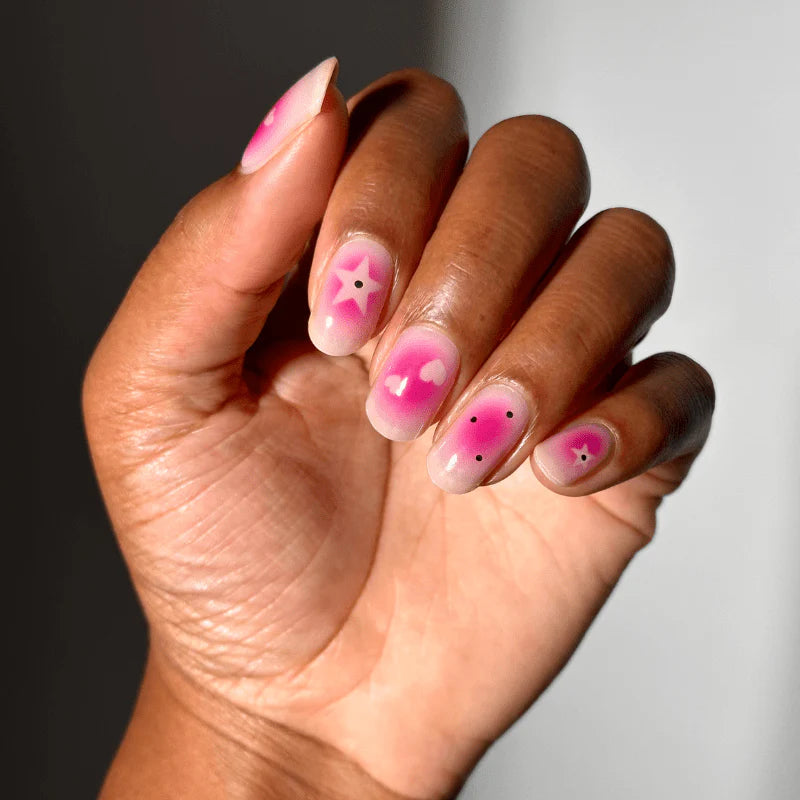 Pinkfarbene Ombré-Gel-Nagelstreifen mit weißen Herz- und Sternverzierungen. Strahlend, fröhlich und jugendlich – perfekt für alle, die verspieltes Nageldesign mit einem Hauch von Glanz lieben.