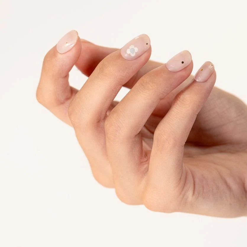 Zarte, nudefarbene Gel-Nagelstreifen mit weißen Blüten und winzigen goldenen Punkten. Dieses minimalistische Blumendesign verleiht Ihren Nägeln einen frischen und gepflegten Look – perfekt für den Alltag oder ein natürliches Nagelfinish.