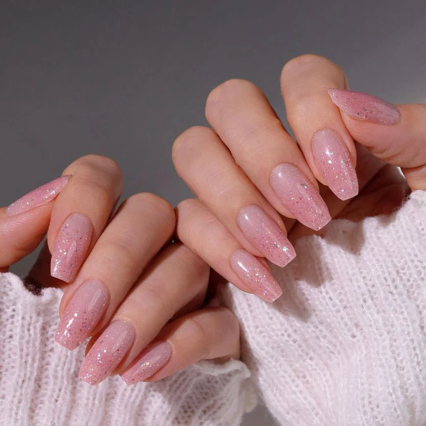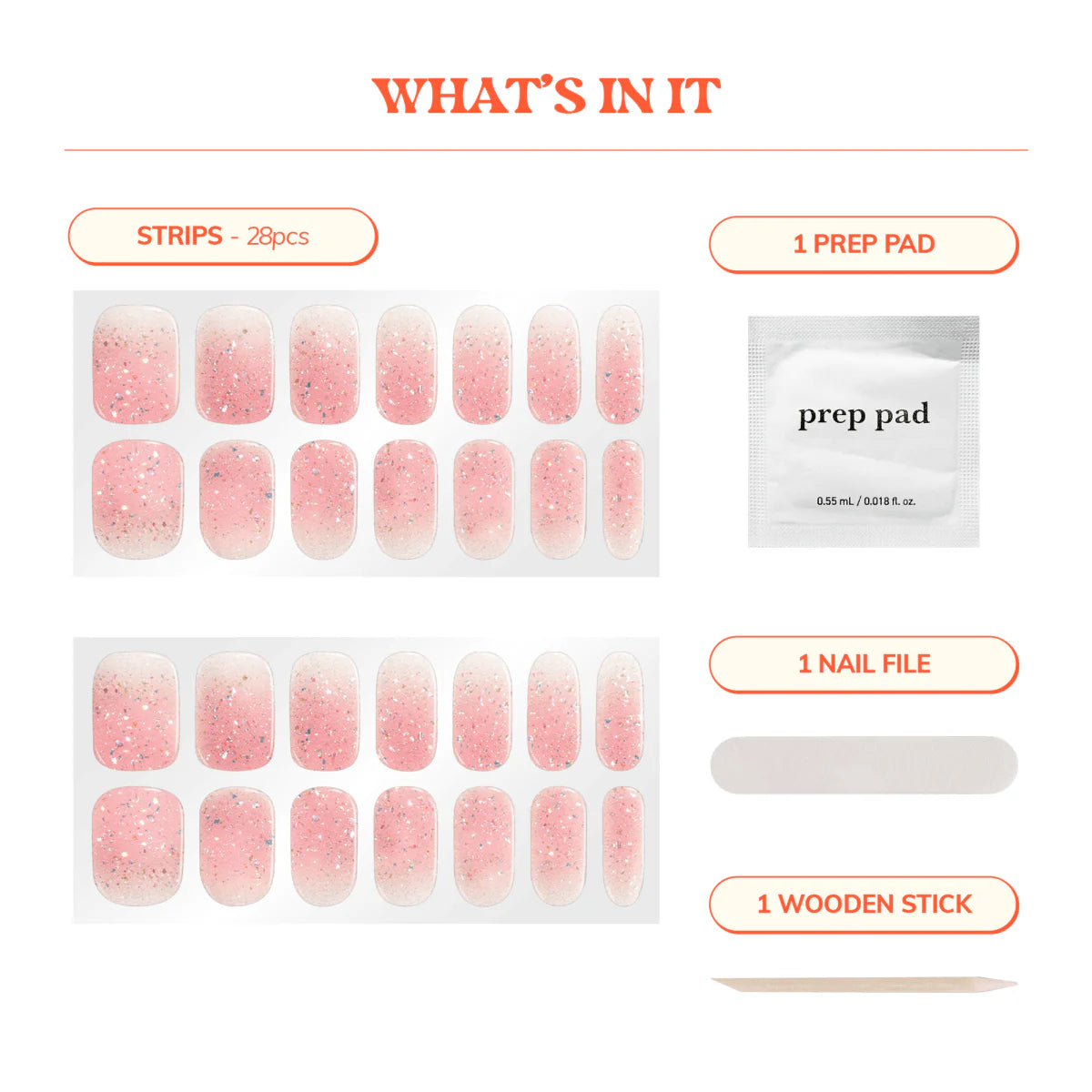 Glitzernde Gel-Nagelstreifen in Pink mit Ombré-Effekt, die in jedem Licht funkeln. Ein glitzernder, pinkfarbener Farbverlauf, der sofortigen Glanz verleiht – ideal für Silvester oder wann immer du deine Nägel zum Strahlen bringen möchtest.