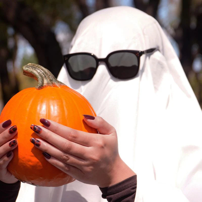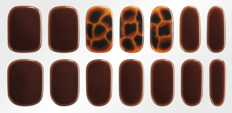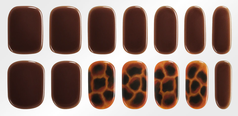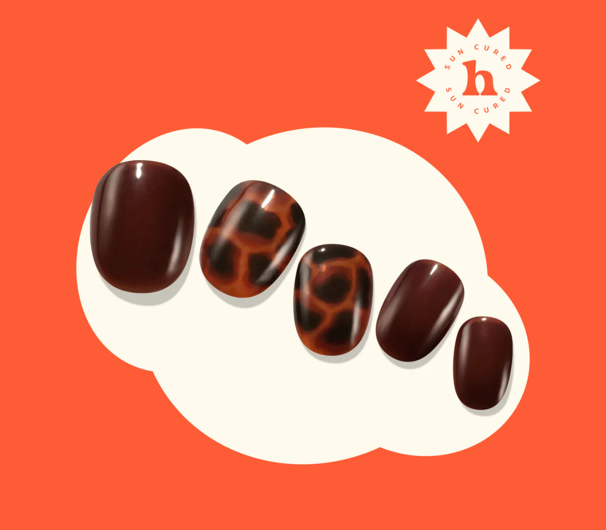 Heyhae Solar Gel Nails. Schildpatt, aber gruselig. Wirbel aus Bernstein und Geleebraun sorgen für eine gespenstische Waldstimmung – geheimnisvoll, kantig und glamourös für die Nacht.