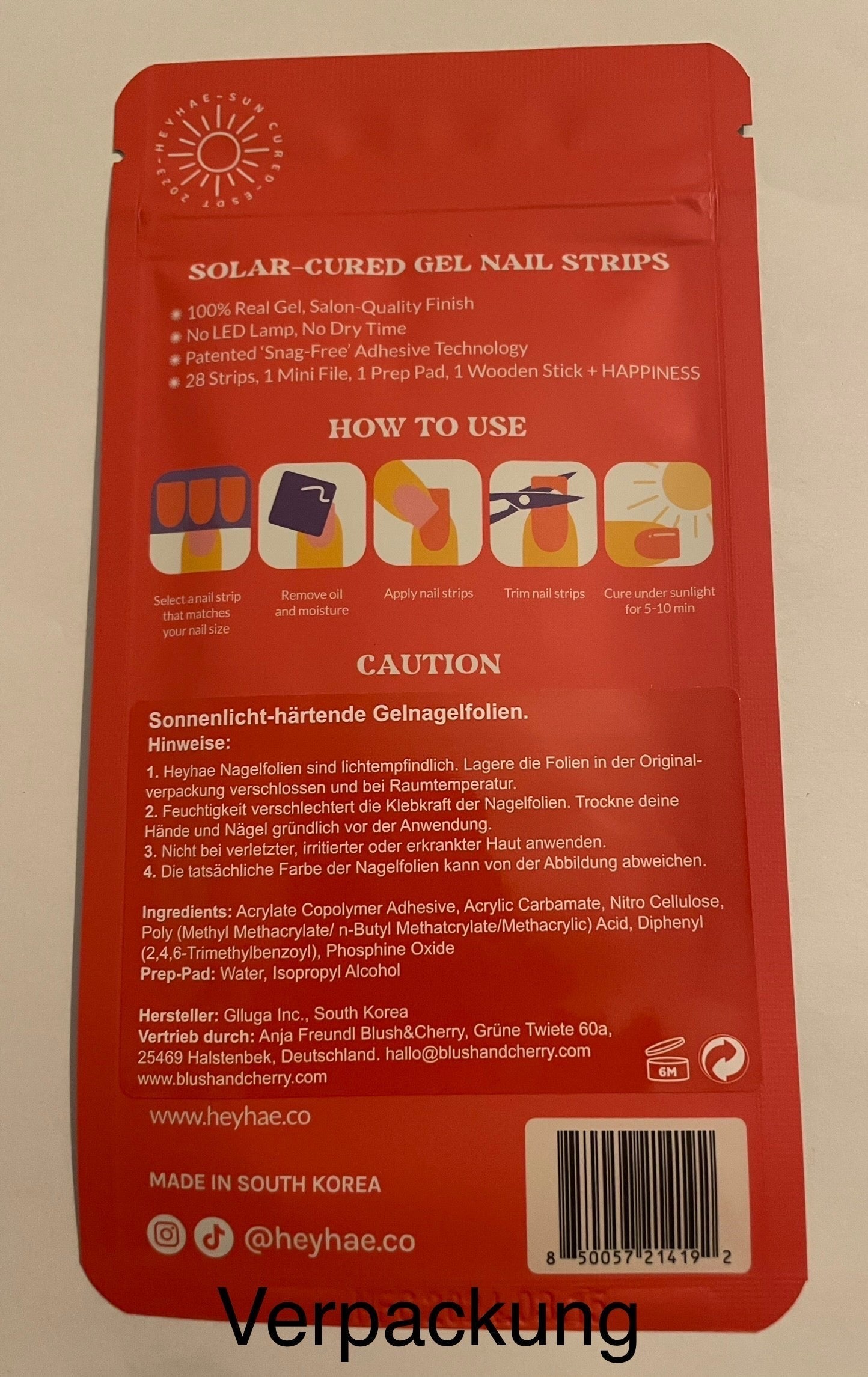 Bitte beachte: Je nach Stärke deiner UV-Lampe kann die Aushärtezeit unterschiedlich sein. Bitte teste deshalb, ob sich deine Folien noch mit dem Nagel eindrücken lassen. Die Folie ist optimal ausgehärtet, wenn sie sich nicht mehr eindrücken lässt. Vermeide eine Überhärtung. Ein falsches Aushärten kann zu Chipping führen! Nicht zum Verlängern des Naturnagels geeignet. Achte unbedingt darauf, dass deine Nägel vor dem Kleben ganz trocken sind, da Wasser mit dem Kleber reagieren kann und die Haltbarkeit der Folie beeinträchtigen kann.