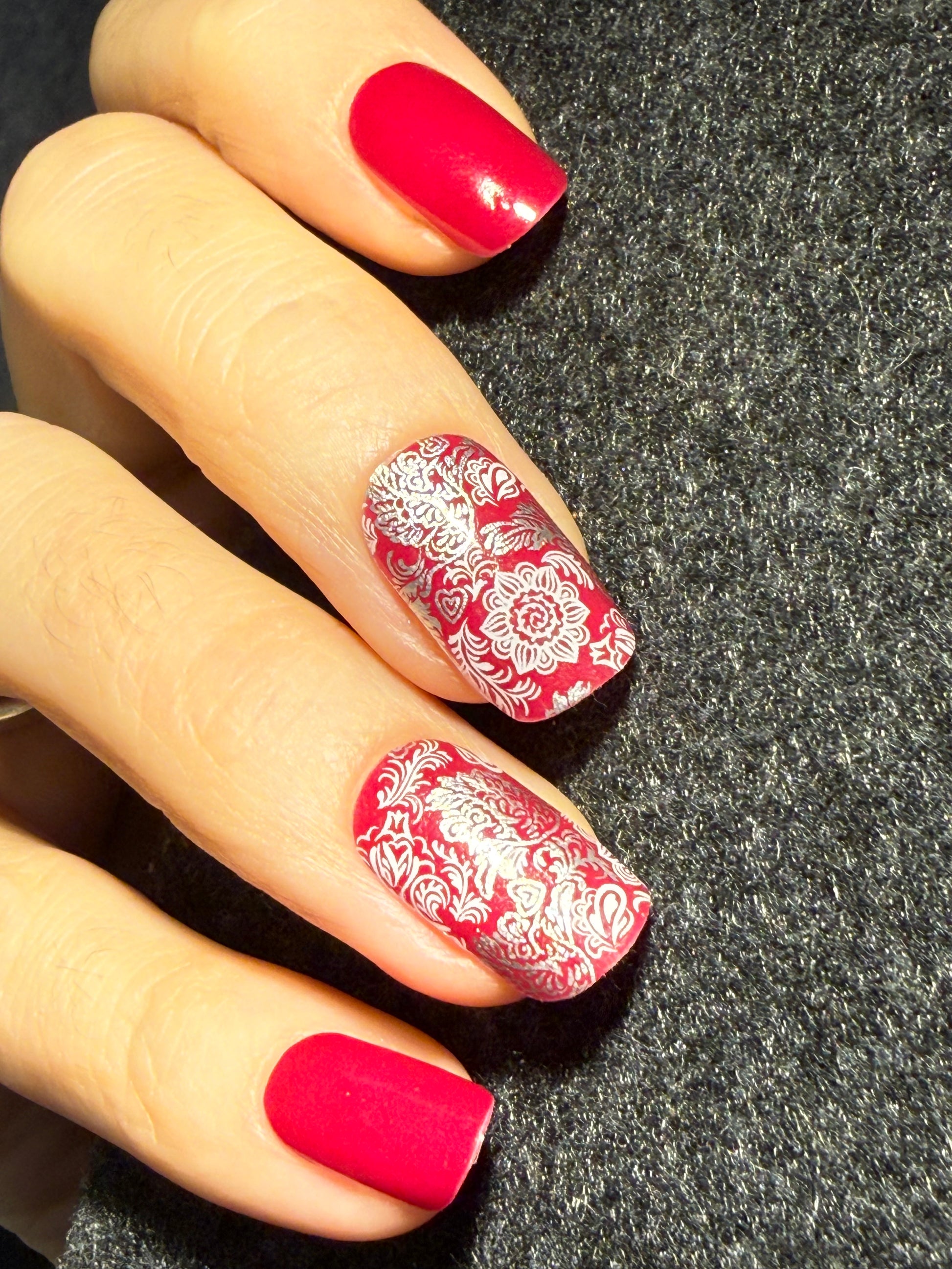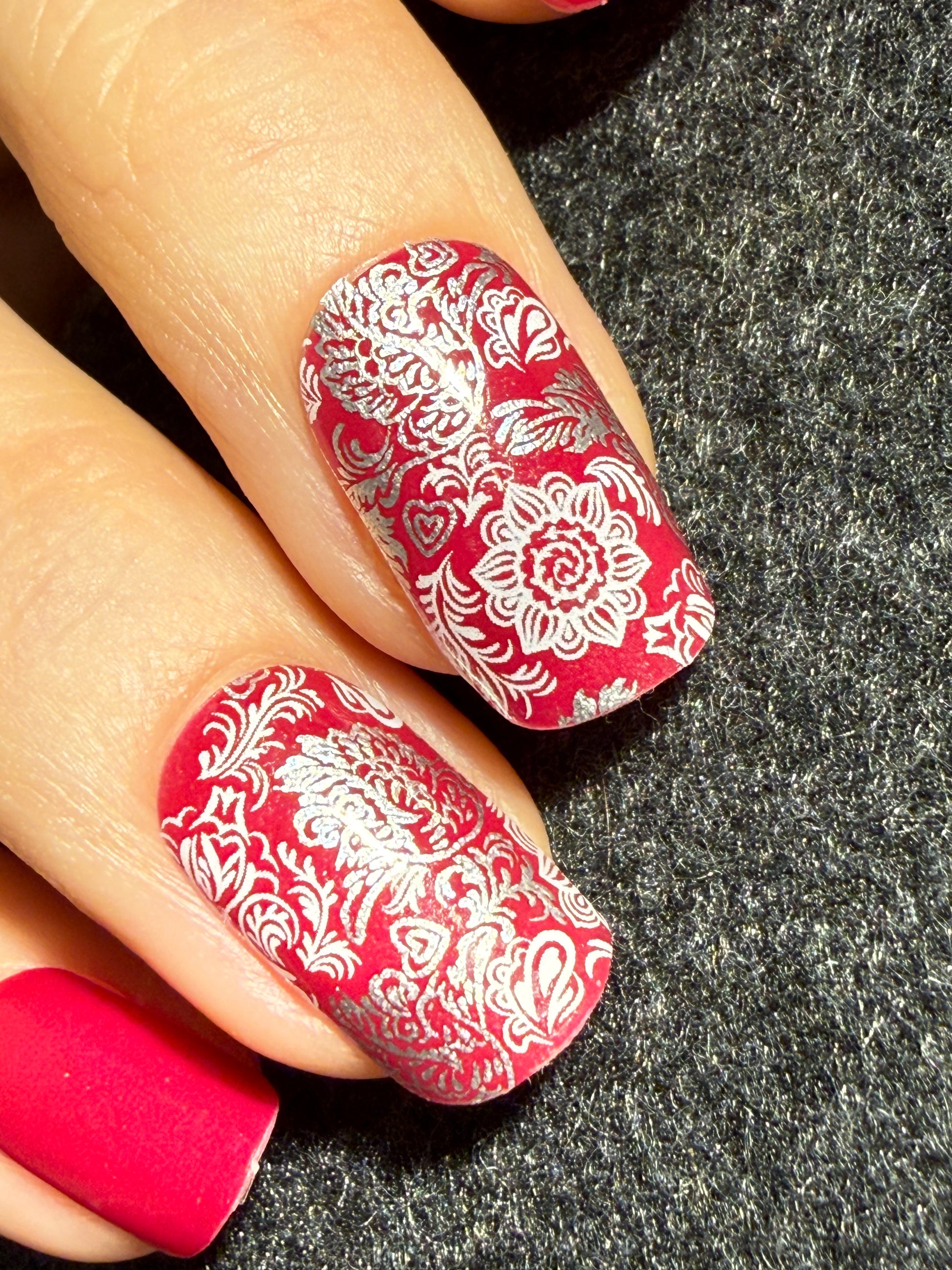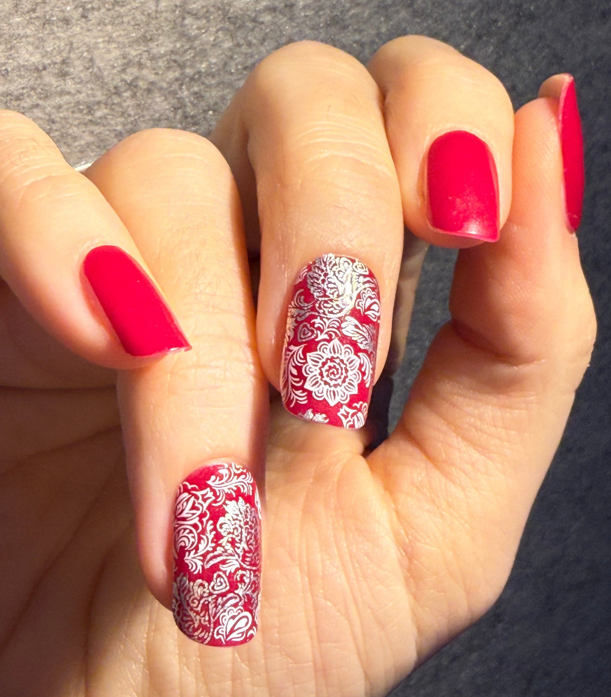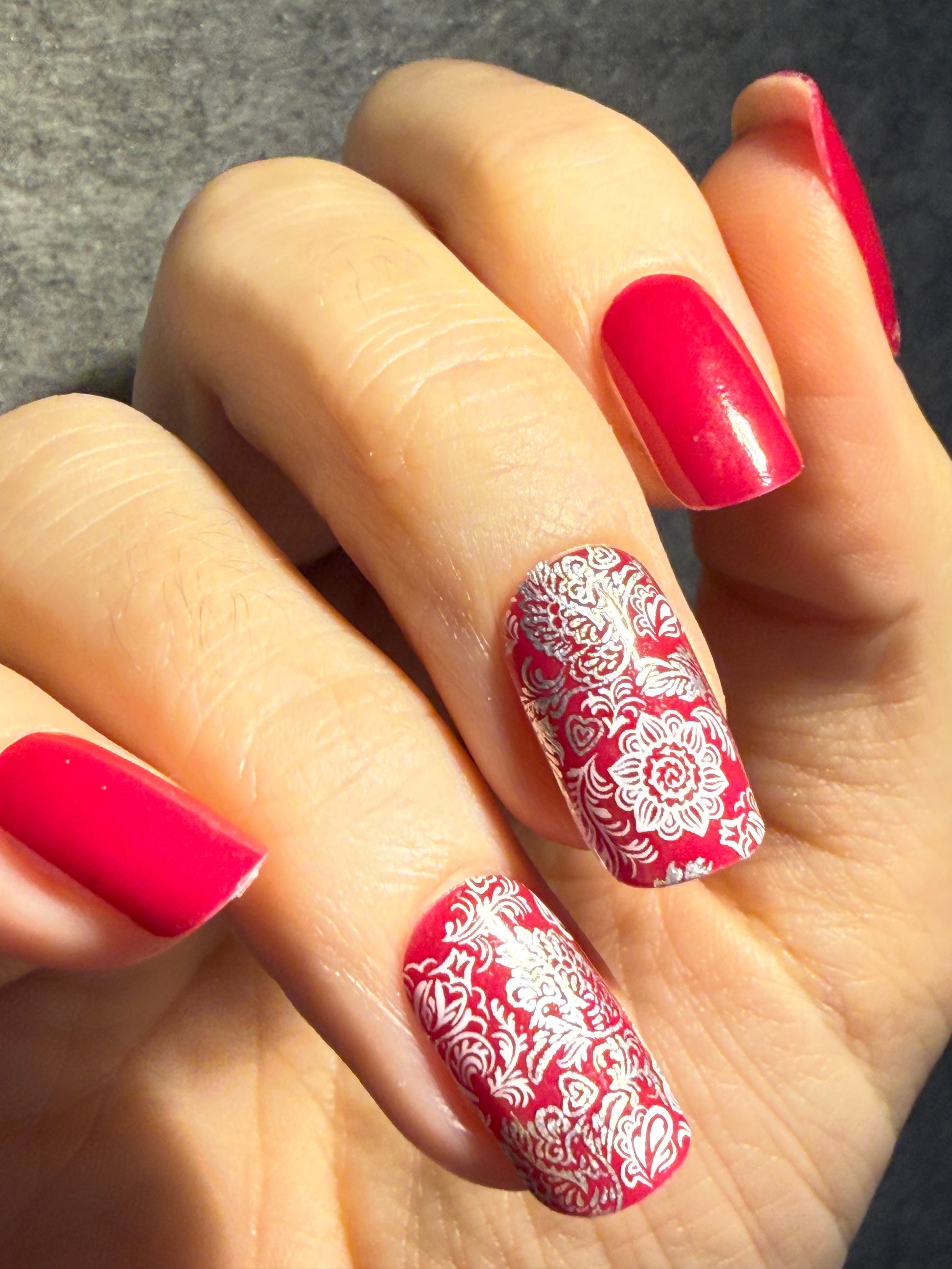 Overlays sind teiltransparent und kommen am besten zur Geltung, wenn sie über eine farbige Folie oder farbigen Nagellack geklebt werden. Hier geklebt auf der Folie “Spanish Red” und “Uni Helene”.