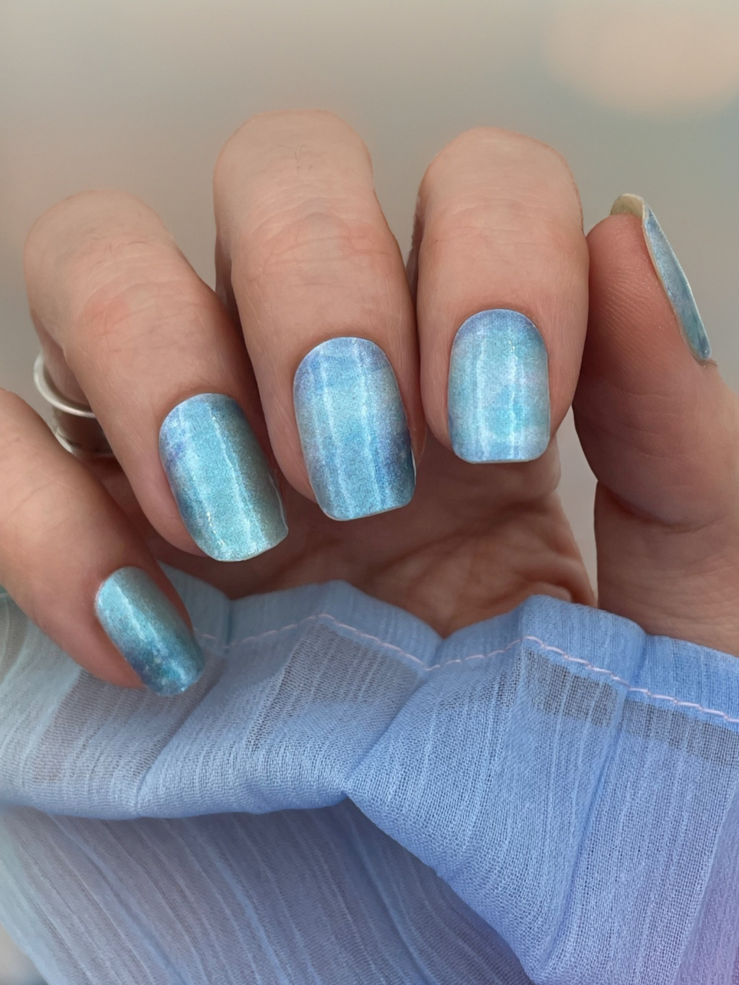 Blau-grün schimmernde Nagelfolie mit zartem Perleffekt