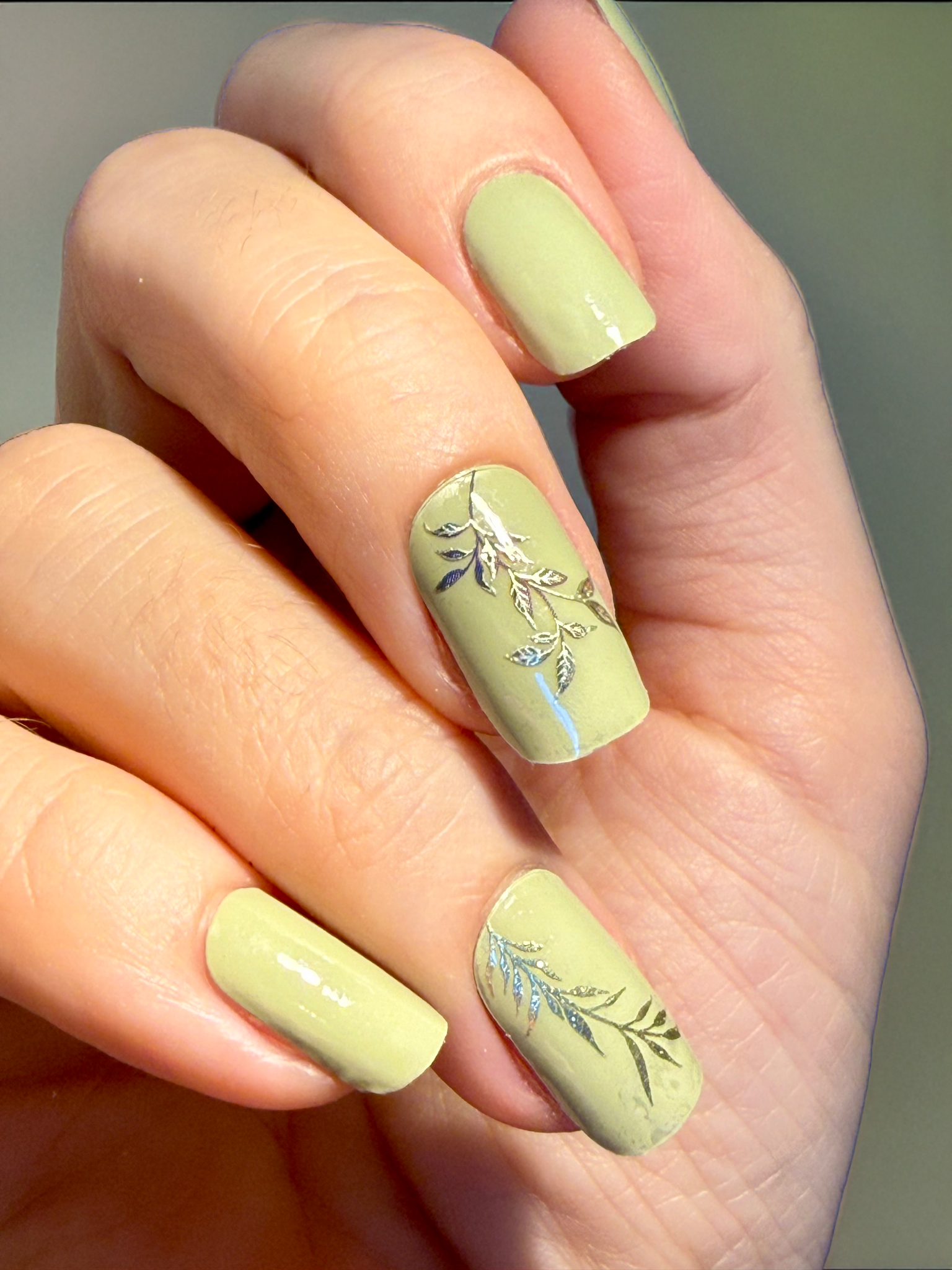 Overlays sind teiltransparent und kommen am besten zur Geltung, wenn sie über eine farbige Folie oder farbigen Nagellack geklebt werden. Diese Folie wirkt besonders gut auf hellem Grund. In den Tragebildern pur, auf “Uni Alabaster” und auf “Mirror Glaze” geklebt.