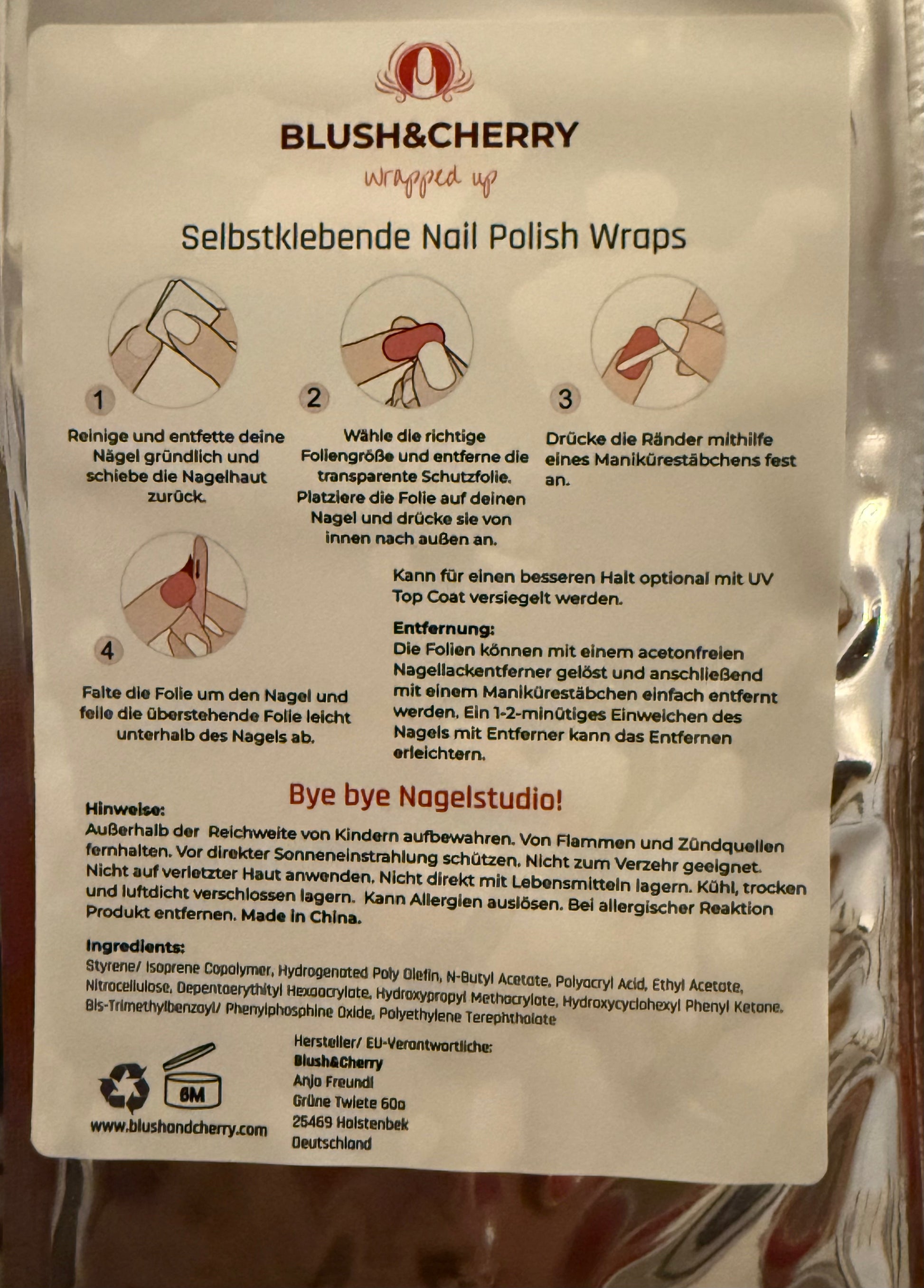 Hersteller und Importeur: Blush&Cherry/ Anja Freundl, Grüne Twiete 60a, 25469 Halstenbek,