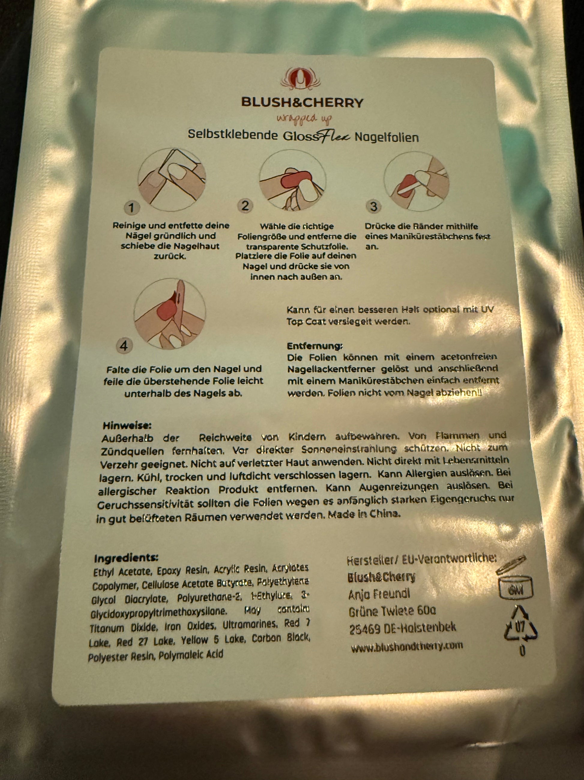 Es wird empfohlen, die Nagelfolien nach spätestens 14 Tagen - bei Liftings oder Haftungsproblemen sofort - mit Hufstäbchen / Multitool und Nagellackentferner zu entfernen, nicht abziehen. Nicht zum Verzehr geeignet, außerhalb der Reichweite von Kindern aufbewahren. Vor direkter Sonneneinstrahlung schützen, dunkel, kühl und trocken lagern. Keine direkte Lagerung mit Lebensmitteln. Von Flammen und Zündquellen fernhalten. Luftdicht verschlossen lagern.
