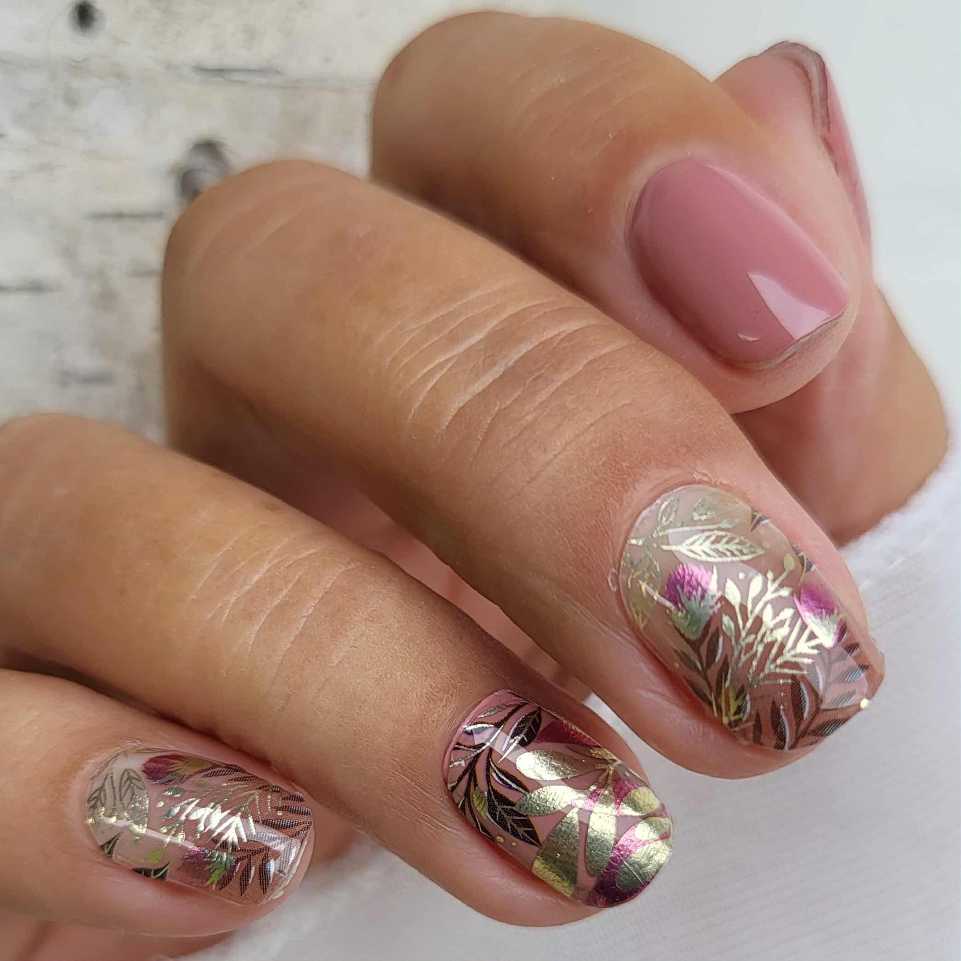 Overlay mit metallischen Pflanzen, Blättern und Ranken. Auf den Tragefotos geklebt auf “Uni Alabaster”, “Antique Rose” und “Faded Love”.