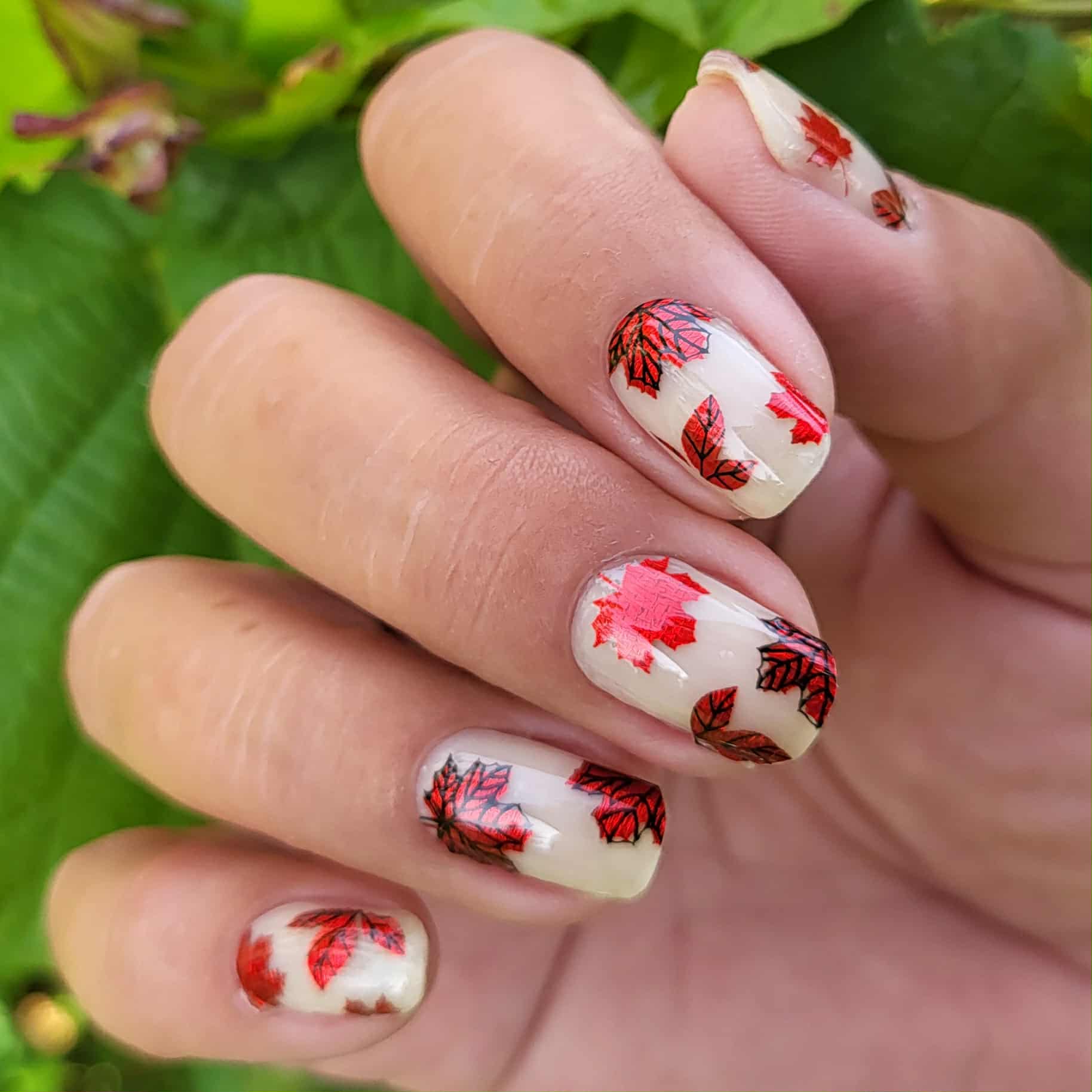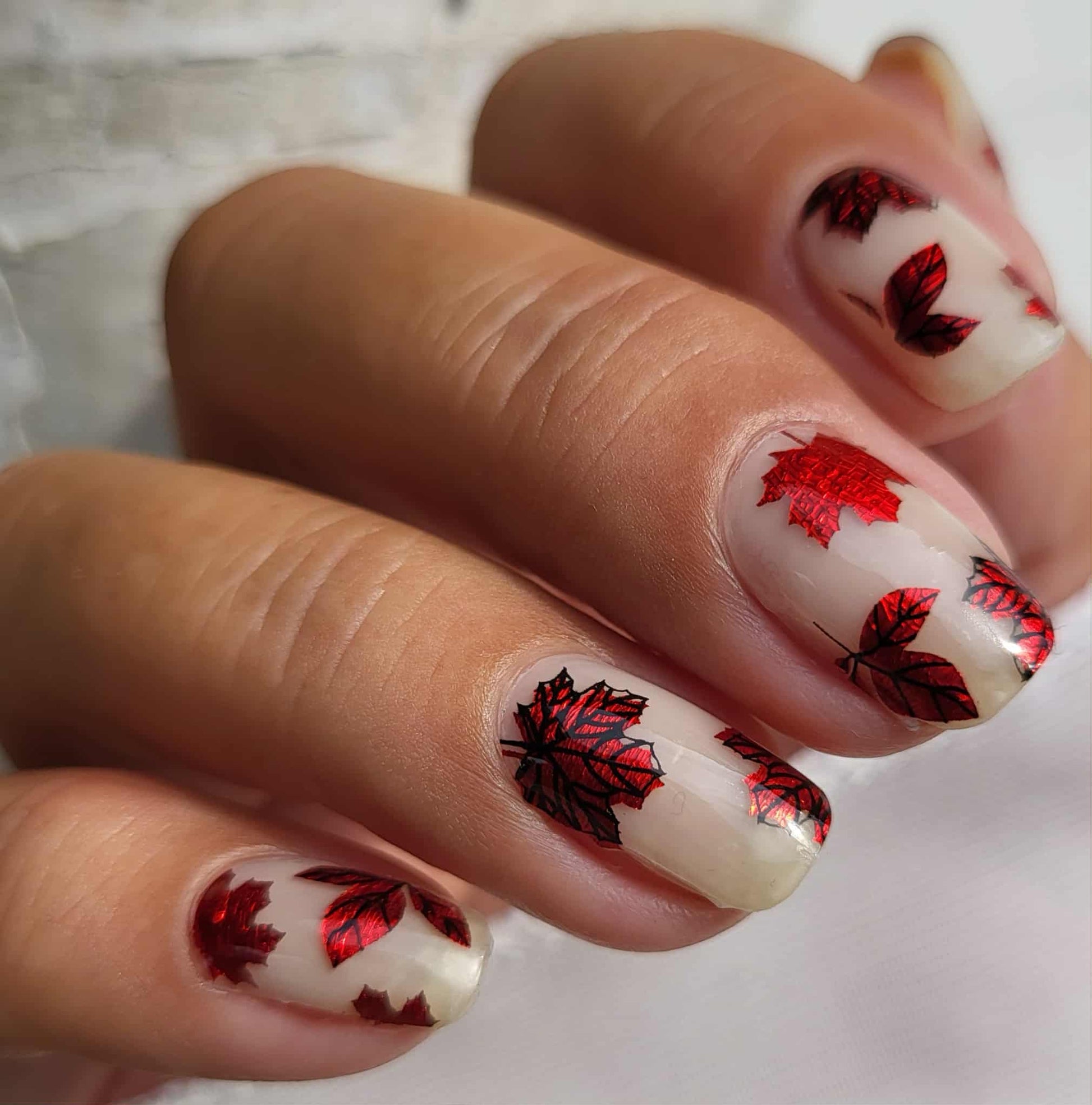Overlays sind teiltransparent und kommen am besten zur Geltung, wenn sie über eine farbige Folie oder farbigen Nagellack geklebt werden. Hier auf milchigem Untergrund geklebt.